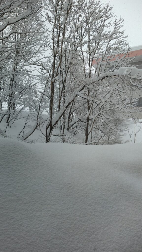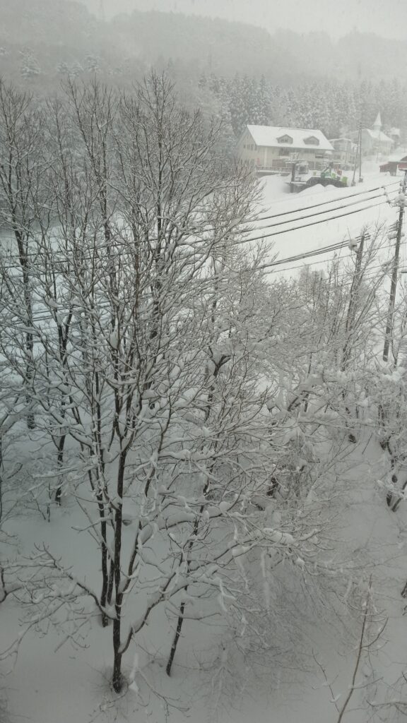 窓の外を見ると、木々も線路も建物も、すべてが真っ白な雪のベールに包まれています。枝という枝が雪をたっぷりと抱え込み、まるで綿菓子のよう。視界も霞むほどの降雪で、「今日は本当に滑れるのかな?」と一瞬不安になりました。
