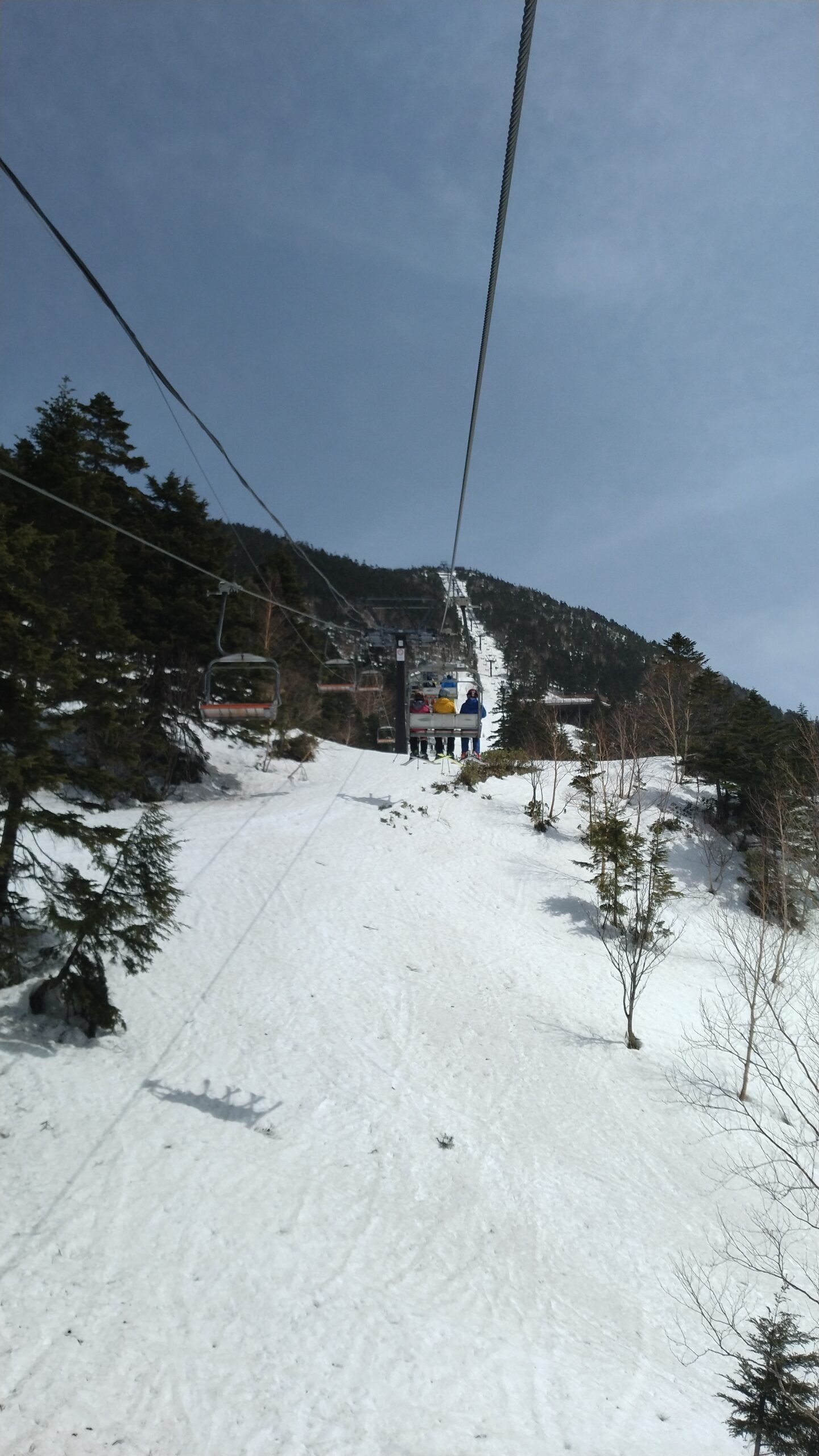 到着した横手山スキー場は、3月とは全く違う雰囲気でした。雪はまだしっかりと残っているものの、空気はすっかり春。リフトに乗りながら見える景色も、どこか柔らかな光に包まれています。