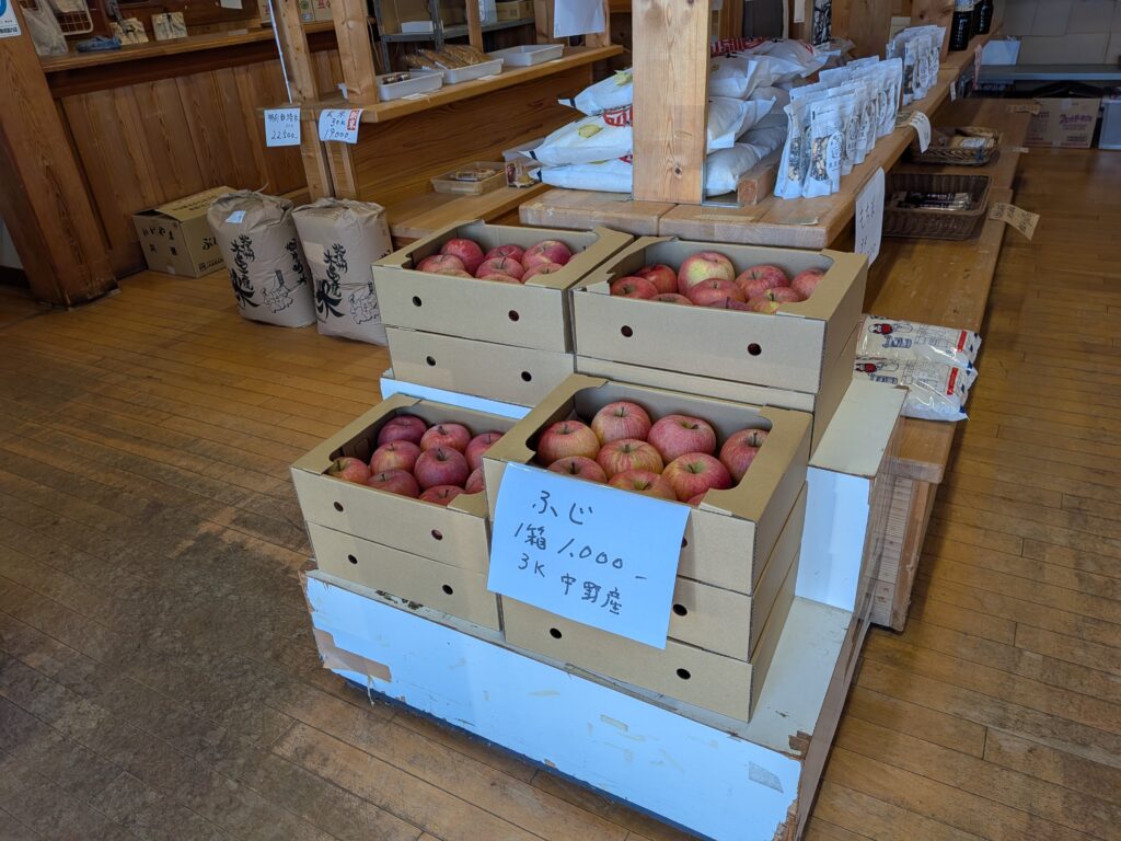 観光交流センター内では、地元産のりんご(ふじ 1箱1,000円/3kg)や、木島平村が誇るブランド米「村長の太鼓判」が販売されています。